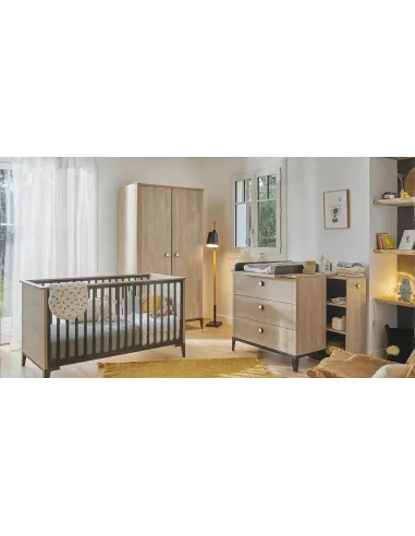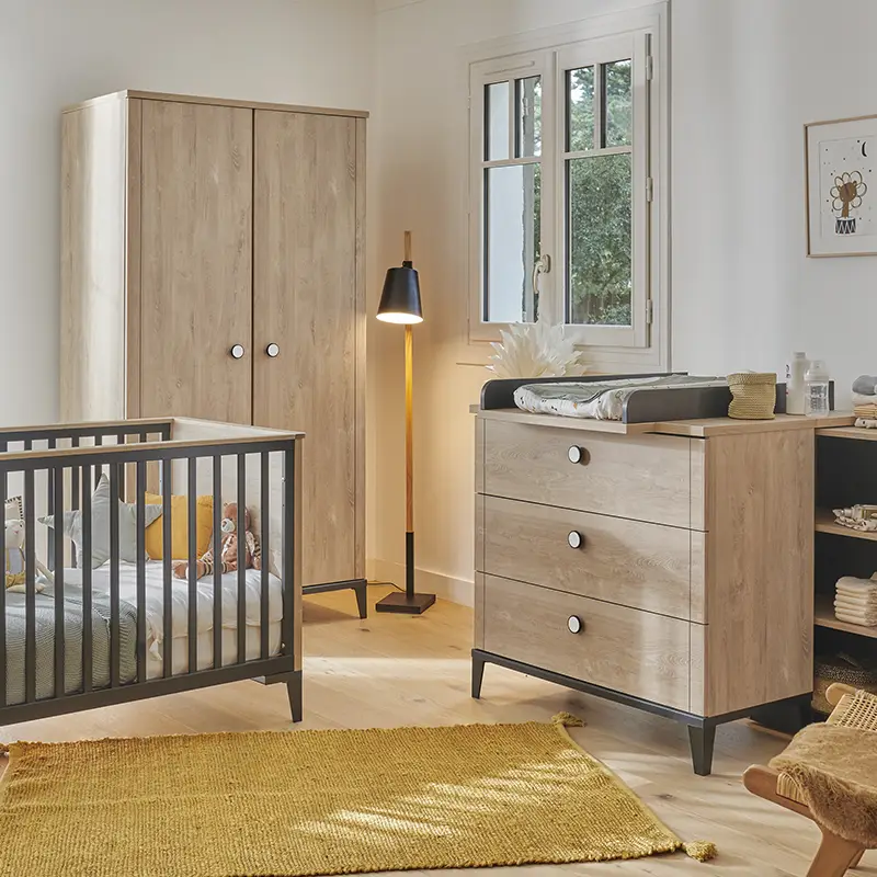 Cette fois, on a pensé à notre ami Marcel : avec leur décor chêne blond et des touches de noir, les meubles donnent à la chambre de bébé un look contemporain et chaleureux. Pratiques, robustes et pensés pour durer.